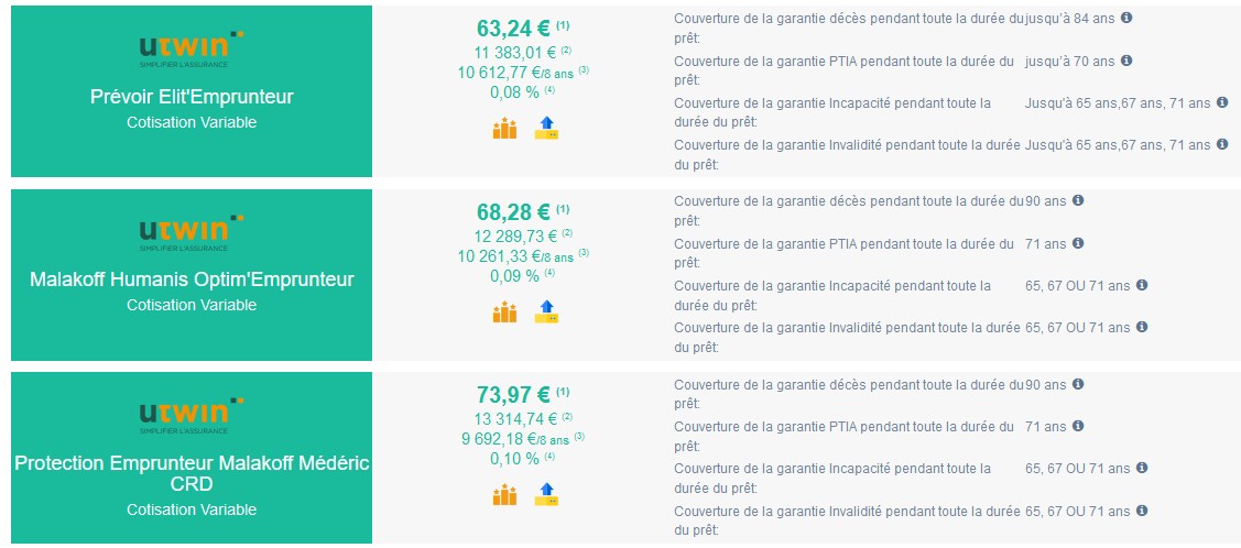 AFI ESCA, GENERALI, METLIFE et sans compter UTWIN avec ses 3 Ontrats en exemple ci-après font parti des compagnies d’assurances incontournables en France. Elles se spécialisent dans les cas particuliers concernant les assurances emprunteur comme les risques de santé aggravés, sports à risque… L’intégration de cette compagnie dans vos devis comparatifs constitue un immanquable avant de finaliser votre choix.